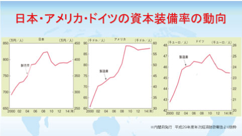 下の表は、資本装備率と製造業の労働生産性水準から算出したものです。 日本は、1ドルの設備投資に対して1.36ドルの収益をあげています。一方、ドイツでは1.98ドもの収益を上げています。なんと、ドイツは同じ1ドルから日本の約1.5倍もの利益を生み出しているのです。同様にアメリカでも日本の1.2倍の利益を生み出しています。
